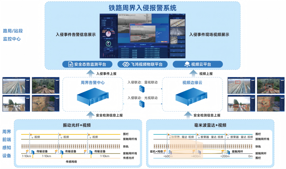 铁路周界入侵报警系统由dcbox小金库app与华为公司联合打造,采用dcbox小金库app视频云一体化平台与华为公司边端入侵检测算法结合,前端采用光纤传感、微波雷达技术,构建端边云协同、全网智能化的方案,实现全天候、长覆善的实时目标识别、告警,以多维度融合模式识别算法和深度神经抗干扰算法,保证了“0”漏报和低误报率,具有高可用性,节省无效复核时间,可应用于铁路沿线人员及大型动物入侵监测、自然灾害易发区域监测、桥梁隧道基础设施监测等场景。