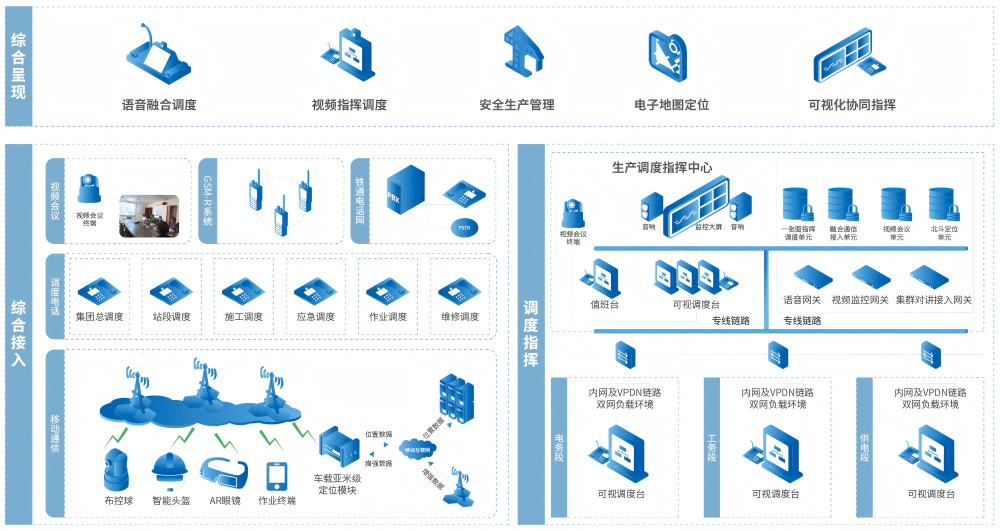 铁路站段可视化生产调度系统基于飞鸿融合调度通信平台,同时与铁路专网、铁通电话网、生产调度信息系统、GIS、北斗高精定位等系统/技术融合互通,为各站段生产作业给予了多源音视频通信,作业计划、线路信息等融合,作业过程可管可联控、智能复盘总结等功能,将生产调度指挥从办公室延伸到班组作业现场,满足高效生产作业协同、调度通信、远程指导、应急处置等需求,进一步提升站段生产管理信息化、数字化能力。